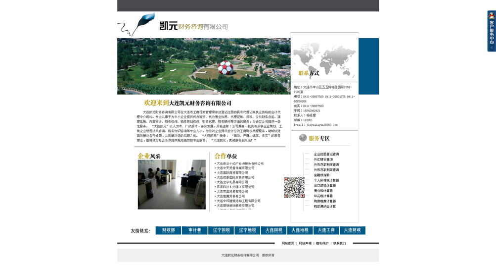 大連凱元財(cái)務(wù)咨詢有限公司在大連市工商行政管理局依法登記注冊(cè)的具有代理記帳執(zhí)業(yè)資格的會(huì)計(jì)代理中介機(jī)構(gòu)。專業(yè)從事于為中小企業(yè)提供代辦驗(yàn)資、代辦營(yíng)業(yè)執(zhí)照、代理記帳、報(bào)稅、公共財(cái)務(wù)總監(jiān)、清理亂帳、內(nèi)部審計(jì)、財(cái)務(wù)咨詢、稅務(wù)籌劃咨詢、財(cái)務(wù)代理、財(cái)務(wù)顧問等方面的服務(wù),為設(shè)立公司提供一條龍服務(wù)。 “大連凱元”以人為本、廣納賢才,務(wù)實(shí)發(fā)展,開拓進(jìn)??;公司擁有一批具有從事企業(yè)策劃、工商企業(yè)管理法規(guī)咨詢、稅務(wù)知識(shí)咨詢等專業(yè)人才,為您的企業(yè)提供全方位的工商財(cái)稅代理服務(wù),能夠快速高效解決各種難題,從而解決您的后顧之憂。 “大連凱元”秉承: “高效、嚴(yán)謹(jǐn)、誠(chéng)信、務(wù)實(shí)”的服務(wù)理念,愿竭誠(chéng)為社會(huì)各界提供規(guī)范高效的專業(yè)服務(wù)。 “大連凱元,真誠(chéng)服務(wù)到永遠(yuǎn)!”